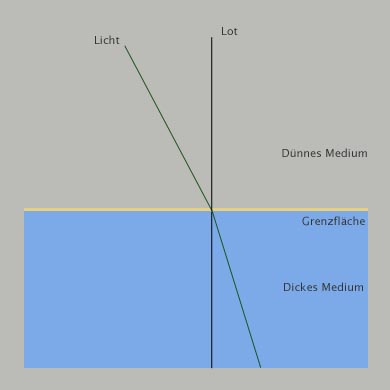 Eine Brechung des Lichtes (Refraktion) tritt immer da auf, wo sich das Medium, in dem sich das Licht befindet, sich aendert. So beispielsweise an der Grenzflaeche von Luft und Wasser. Die Brechung findet immer dann statt, wenn der Einfallswinkel nicht senkrecht ist.