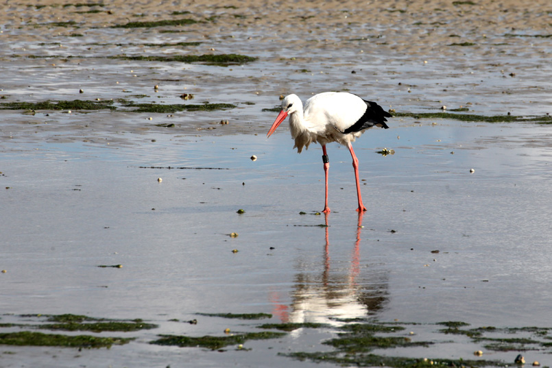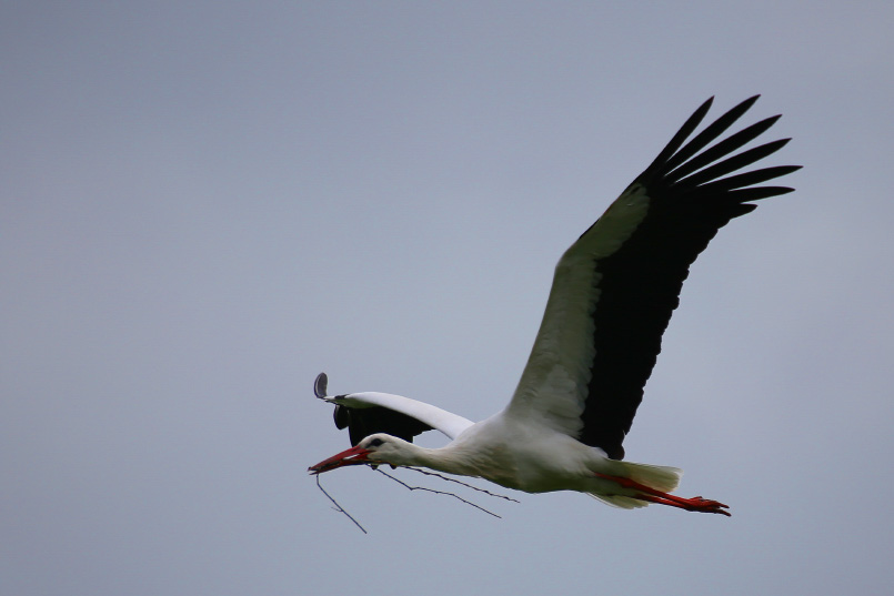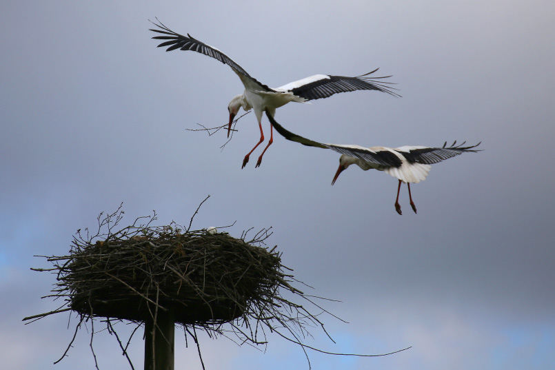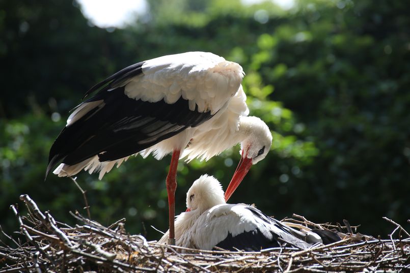 Störche wohnen auf den Storchennestern, die gerne auf Hausdächern gebaut werden.