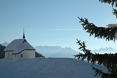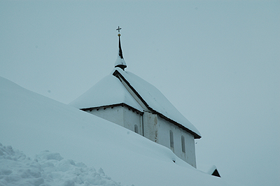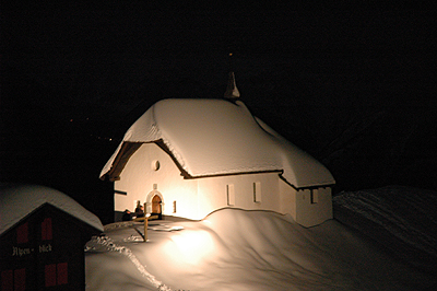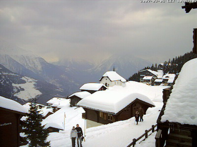 Webcambild der Bettmeralp. Im Vordergrund sind wir zwei zu finden. Im Hintergrund die Kapelle im Ortund in den Wolken die Mischabelgruppe.