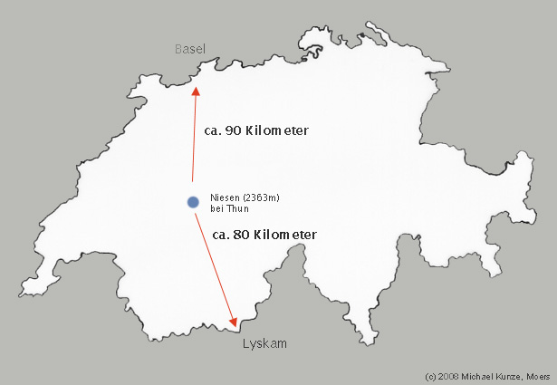 und ein geografisches Interesse hat. Auf dem Niesen am Thuner See, einem Aussichtspunkt in 2363m Höhe, erreichbar über die Niesenbahn, eine Standseilbahn, kann man einmal quer über die Schweiz