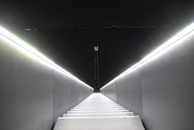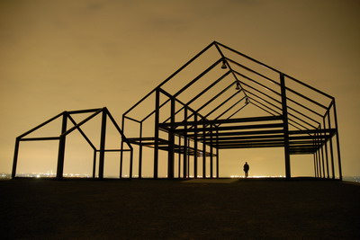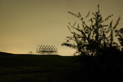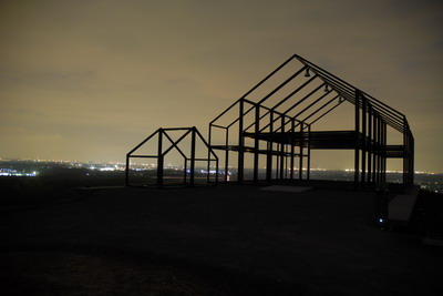 Auf dem Gipfel der Halde Norddeutschland in Neukirchen-Vluyn steht das Hallenhaus. Von weitem ist dieses Gerippe zu sehen.